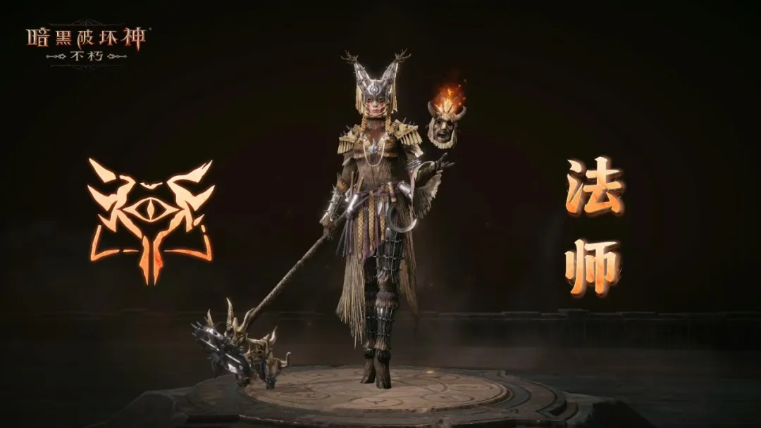 法师掌中托着燃烧的聚能器,那是一具木质图腾,狰狞的面孔被火焰吞噬,跳动的光焰如同不息的心脏,是照亮荒野、驱散黑暗的信标。