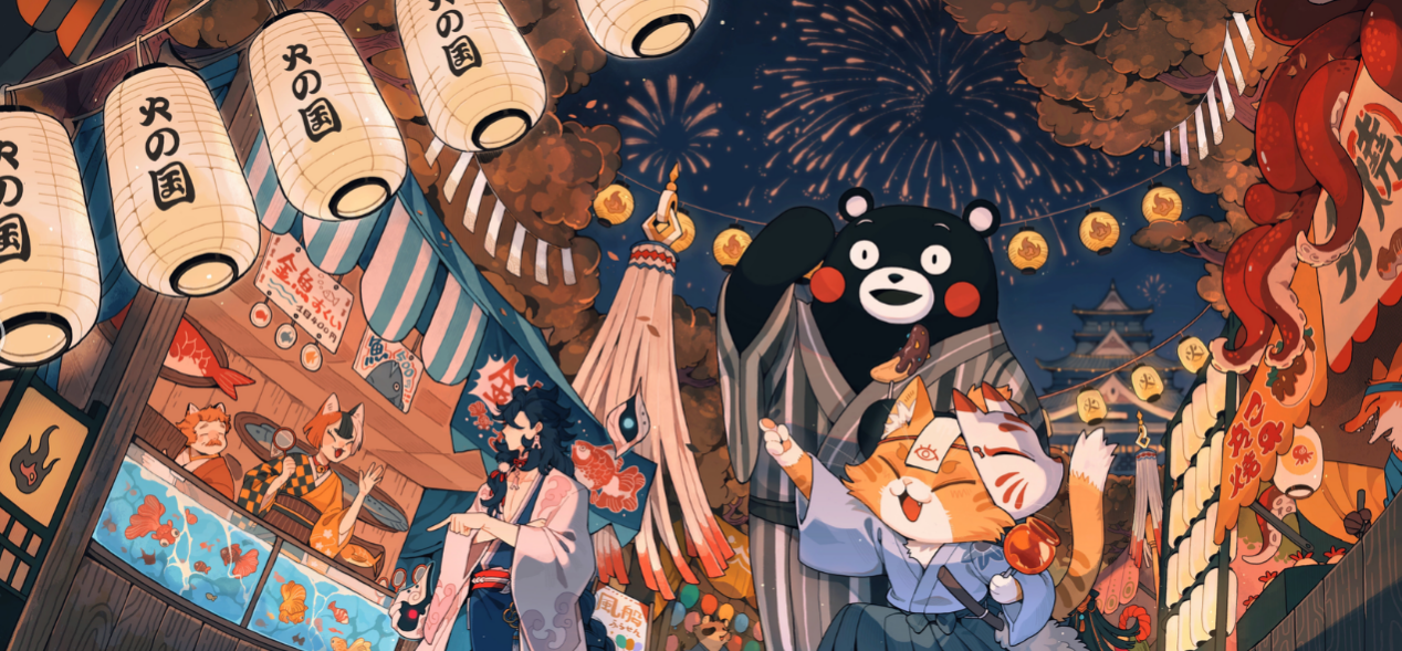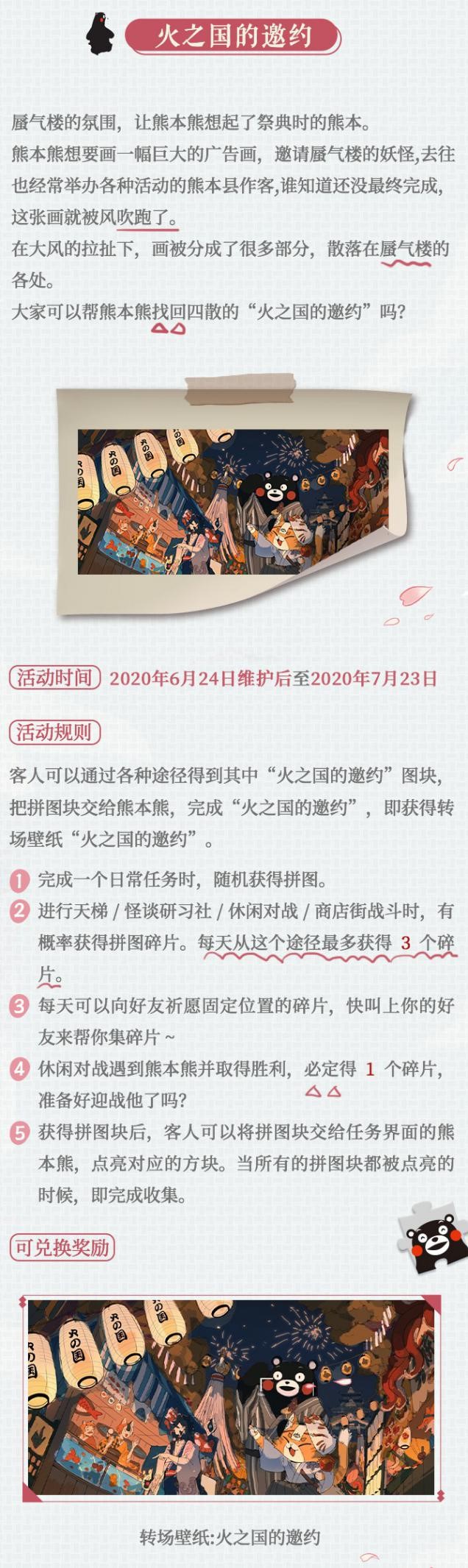 活动期间,玩家们可以通过完成日常任务,参与天梯、怪谈研习社、休闲对战、商店街战斗等,随机获得“火之国的邀约”拼图块。大家也可以通过祈愿,把多余的拼图块送给好友,或是索取自己没有的碎片。把碎片陆续交给熊本熊,解锁全部拼图块后,玩家即可得到“火之国的邀约”转场动画。画面上,熊本与三目一起游荡在祭典时的熊本县,琳琅满目的商品与祭典灯笼,盛放的烟花,洋溢着节日氛围。此外,勾玉屋还会上架限定熊本熊头像,限时售卖。