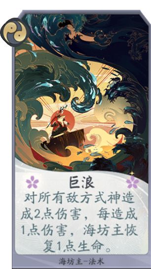 3.同时卡组中还有1张更为直接有力的群伤法术——巨浪。它可以直接对所有式神造成2点伤害。这三张卡牌相辅相成,在中期可以给对方式神带来很大的压力。