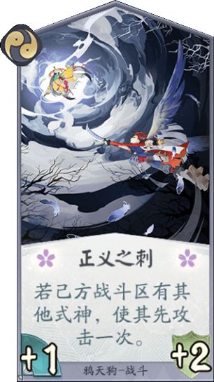 虽然鸦天狗的输出能力并不算高,但是通过用战斗牌正义之刺驱动其他战斗力更高的式神来进行战斗就可以实现一次高额的爆发,甚至有可能在对手不备的情况下,一轮输出就将对手斩杀。