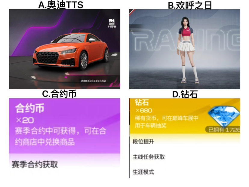 各位车主们大家好!合约是很多小伙伴们每个赛季必不可少的一部分,通过赛季合约可以获得大量资源奖励以及紫车或外观等。本赛季奖励内容紫车为奥迪TTS,外观为欢呼之日。不知道各位最喜欢的奖励是什么呢?投票并说明即可参与活动赢大奖哦!