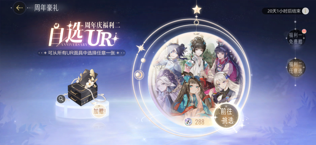 在艺人们的演艺生涯中,出演过许多高质量角色,但也曾错过不少心仪角色,为了弥补大家的遗憾,本次二周年庆,我们们将免费送出一张UR面具,12月21日(本周四)更新后,等级≥25级的艺人可从周年庆入口领取周年豪礼,每位艺人可随机领取1张UR面具哦!