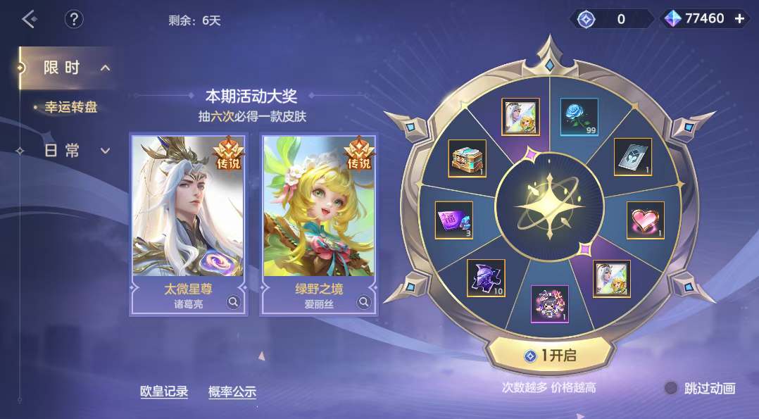 在10月27日-11月3日,“幸运转盘”开启,玩家使用龙晶或完成任务获取幸运币,进行抽奖。诸葛亮·太微星尊、爱丽丝·绿野之境、击败特效自选箱、比心表情、龙魂祈福卡、皮肤碎片、改名卡等奖励等你来抽!最多6抽获得1款皮肤,最多9抽获得全部奖励,前2抽抽到皮肤的守护者会获得欧皇称号。