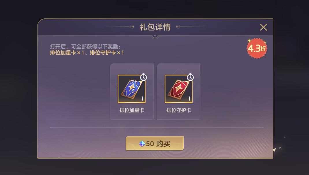 在10月24日-10月31日,新赛季排位礼包限时开售,礼包售价50钻石,奖励包含:排位加星卡*1、排位守护卡*1。