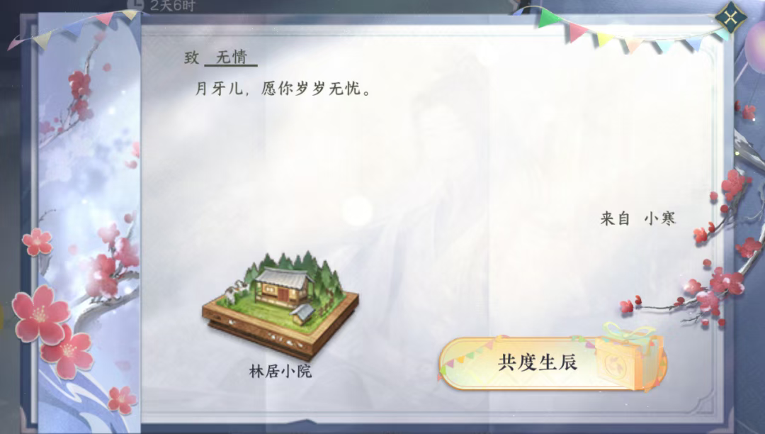 11月1日无情生辰当天,为他题写生辰贺词,表达你的心意吧!完成生辰贺词填写后,可将礼物亲自赠予无情,与他共度生辰,无情也为玩家准备了一份回礼,内含卡牌画册“檐风栖梦”、肩挂·墨狸衔云、道具“林居小屋”,喜欢的玩家不要错过了。