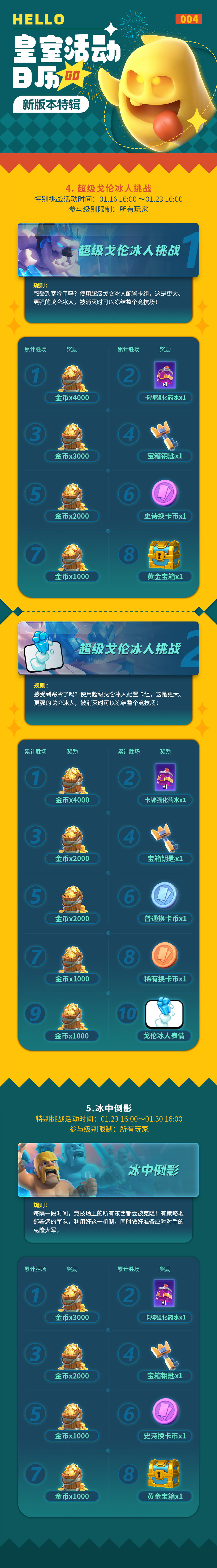 自1月20日起,至1月27日春节假期期间,登录皇室战争,体验新版本内容,参与挑战活动,有盖世武僧登、威猛矿工的登场派对,还有超级戈仑冰人、冰中倒影挑战等多种活动在等着你!除此之外,每日登录游戏,即可领取【新春每日登录礼包】,有金币,有宝箱,更有神秘战旗!