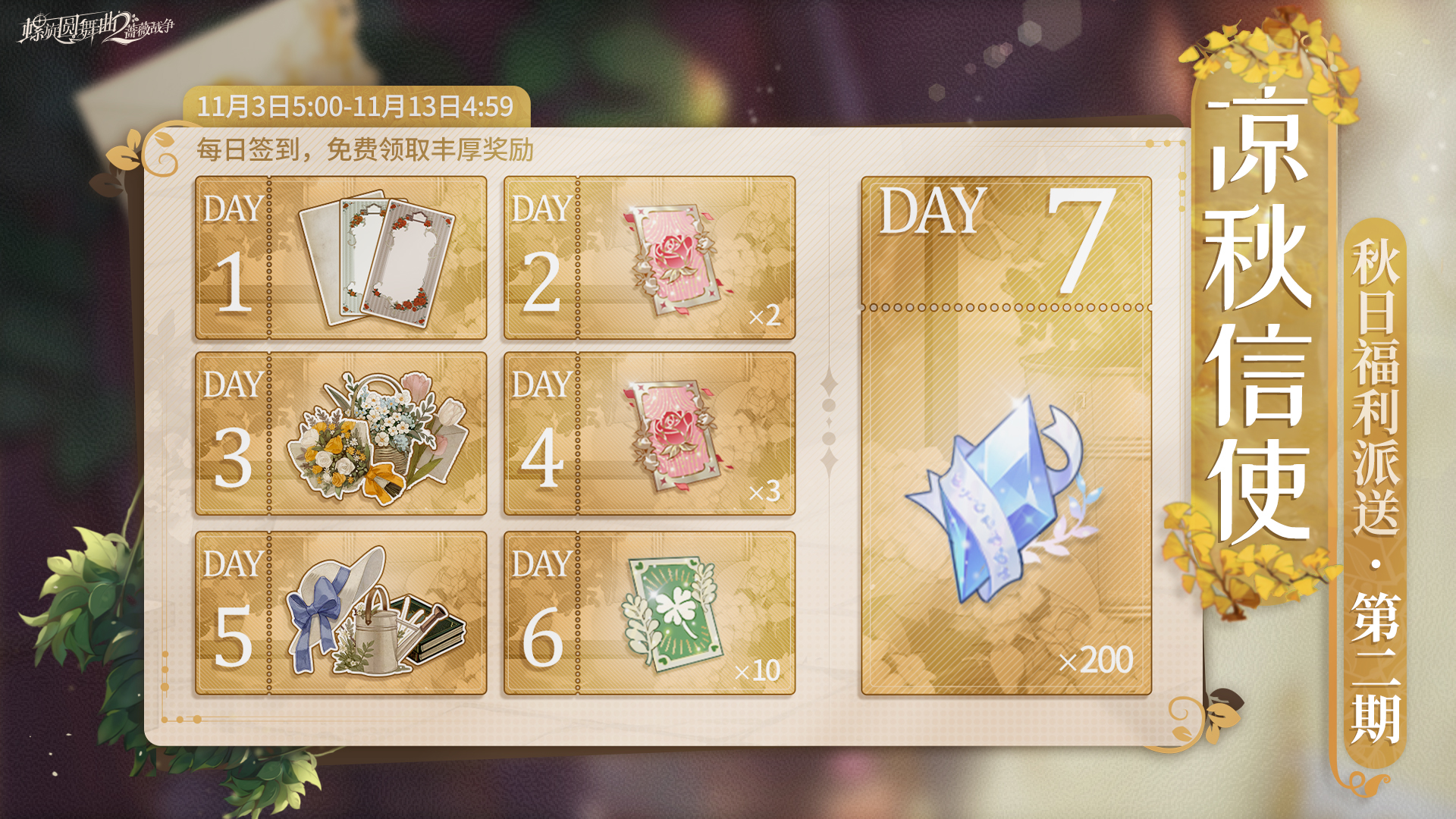 活动期间,每日登录游戏完成凉秋七日签到,可累计免费获得瑰梦券*5、钻石*200、秋日限定贴纸等丰厚奖励。