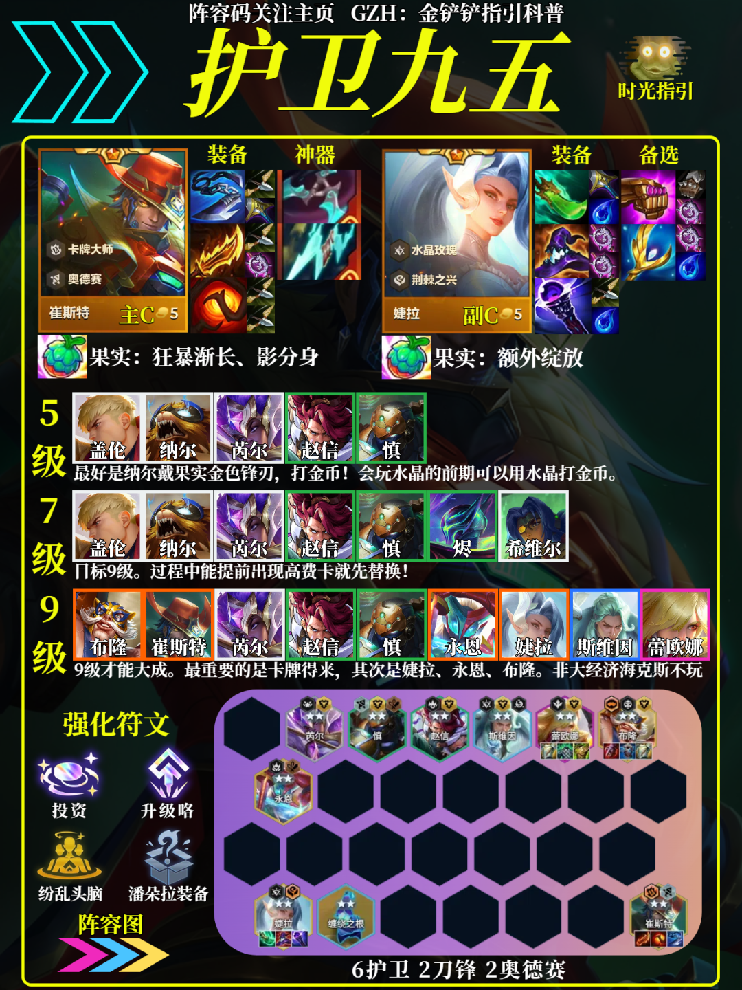 这次更新九五算是支愣起来了,多个五费弈子增强,其中就有:婕拉、卡牌、永恩,但是铲友们得注意:没有经济海克斯别玩,毕竟九五阵容很吃经济。