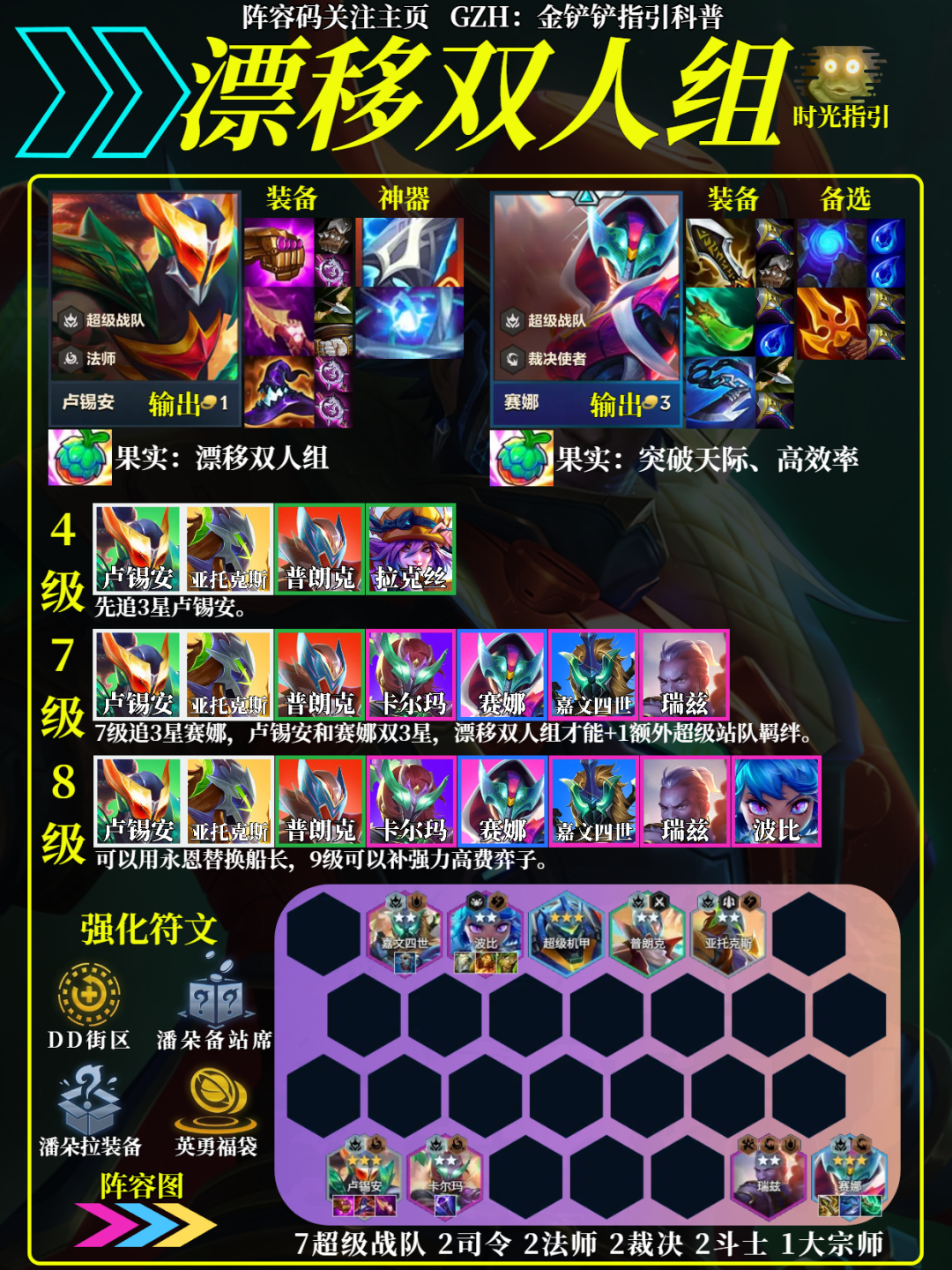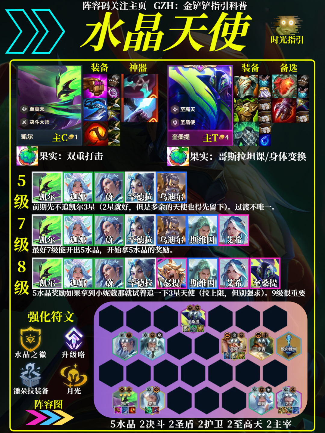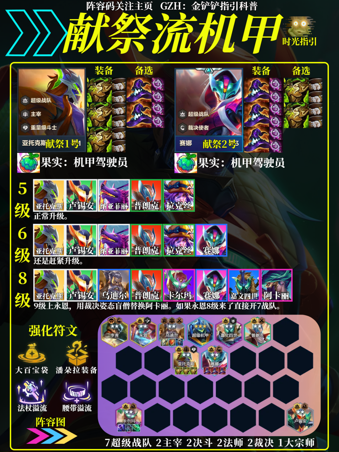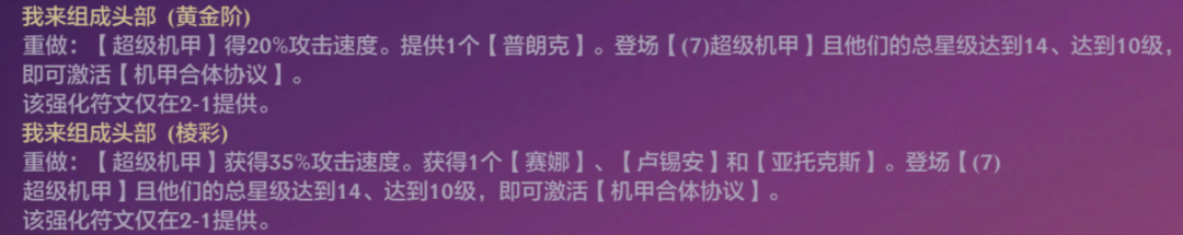第三套:至高天使(详情点击图片放大查看)天使也真是很久没有被削的阵容了,没被削弱就是一种加强哦,而且果实双重打击的概率还加强了。第四套:水晶天使(详情点击图片放大查看)3水晶削弱,7水晶也削弱,但是关我5水晶什么事!这是利用5水晶奖励的装备、经济等提高阵容质量,搭配一些强力弈子的玩法,值得铲友们去玩,强!第五套:关门兵王诺手(详情点击图片放大查看)诺手戴上果实钝器能手,前排都扛不住,钝器能手的无视护甲效果可以和装备穿甲同时起作用。第六套:水晶阿狸(详情点击图片放大查看)阿狸虽然失去了卢登这件神器,但是阿狸的过量击败伤害增加了,搭配5水晶给的奖励阿狸依旧很猛!第七套:飘移机甲(详情点击图片放大查看)通过果实飘移双人组+卢锡安和赛娜3星可以多+1超级站队羁绊,6只超级站队弈子即可开出7超级战队,值得一玩哦。玩机甲如果有“我来组成头部”这个海克斯直接冲着开棱彩机甲去:棱彩的条件变了,大家看看下图,就懂了。第八套:机甲驾驶员(详情点击图片放大查看)机甲玩法(超级站队)的另外一个分支,别看出装有点诡异,但是真的挺强。第九套:学院多C没削弱就是好事,这个阵容现在大家应该还没反应过来,容易独家。第十套:更强照耀拉克丝拉克丝专属果实玩法,本次更新再一次加强,所以铲友们懂了吧。