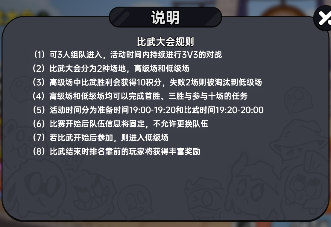 【赢得1场胜利】、【赢得3场胜利】、【参与10场比赛】的任务即可获得比武活跃礼包(概率获得魔法祝福书页、定向锤、高级嬗变粉尘、魂珠等道具奖励)。高级场和低级场均可完成任务。