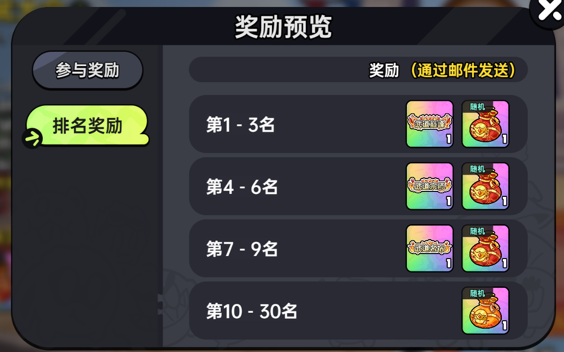 限定称号(【武道巅峰】、【武道宗师】、【武道名宿】)、比武巅峰者礼包、比武优胜者礼包、比武活跃礼包(均可概率获得