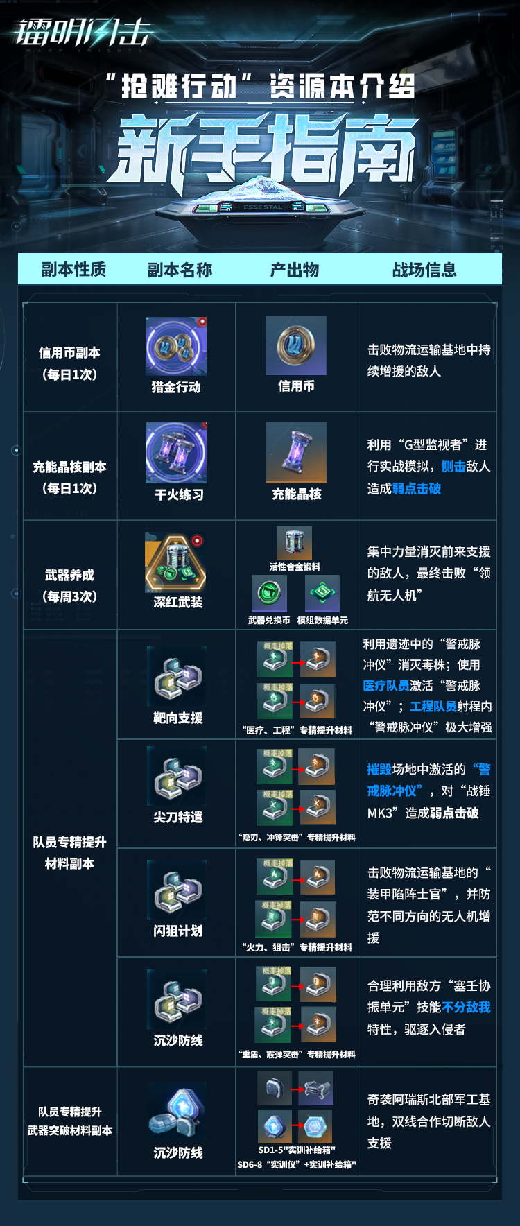 在镭明闪击的战场上,资源掌控能力尤为关键。本次训练营会把所有养成资源和资源副本的产出汇总起来,协助您制定高效获取资源的策略!