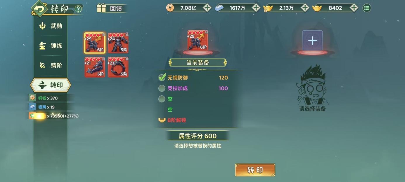 最后提醒:咱们先参加“群侠会舞”和每晚活动攒攒武勋令牌、武勋丹,提升武勋值,一口气换整套装备再转印,别单件瞎折腾。转印前看好词条,优先橙色以上品质,换对技能比盲目锤炼铸阶性价比高多了!