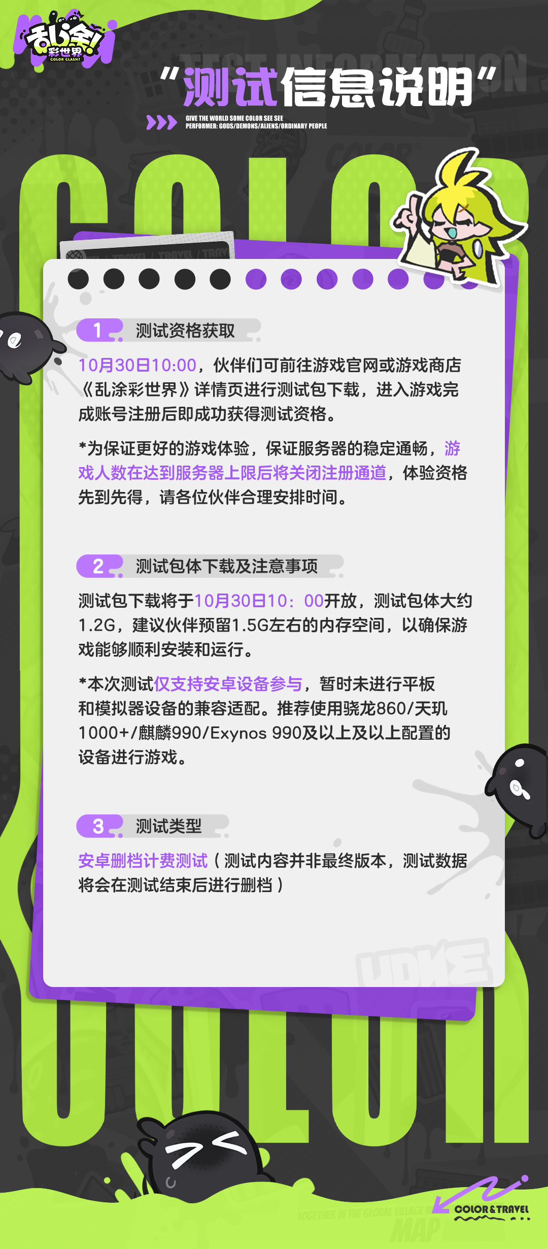 开启,届时伙伴们可以前往游戏官网或游戏商店《乱涂彩世界》详情页下载游戏,进入游戏成功注册账号后即视作成功获取测试资格,期待与伙伴相见!