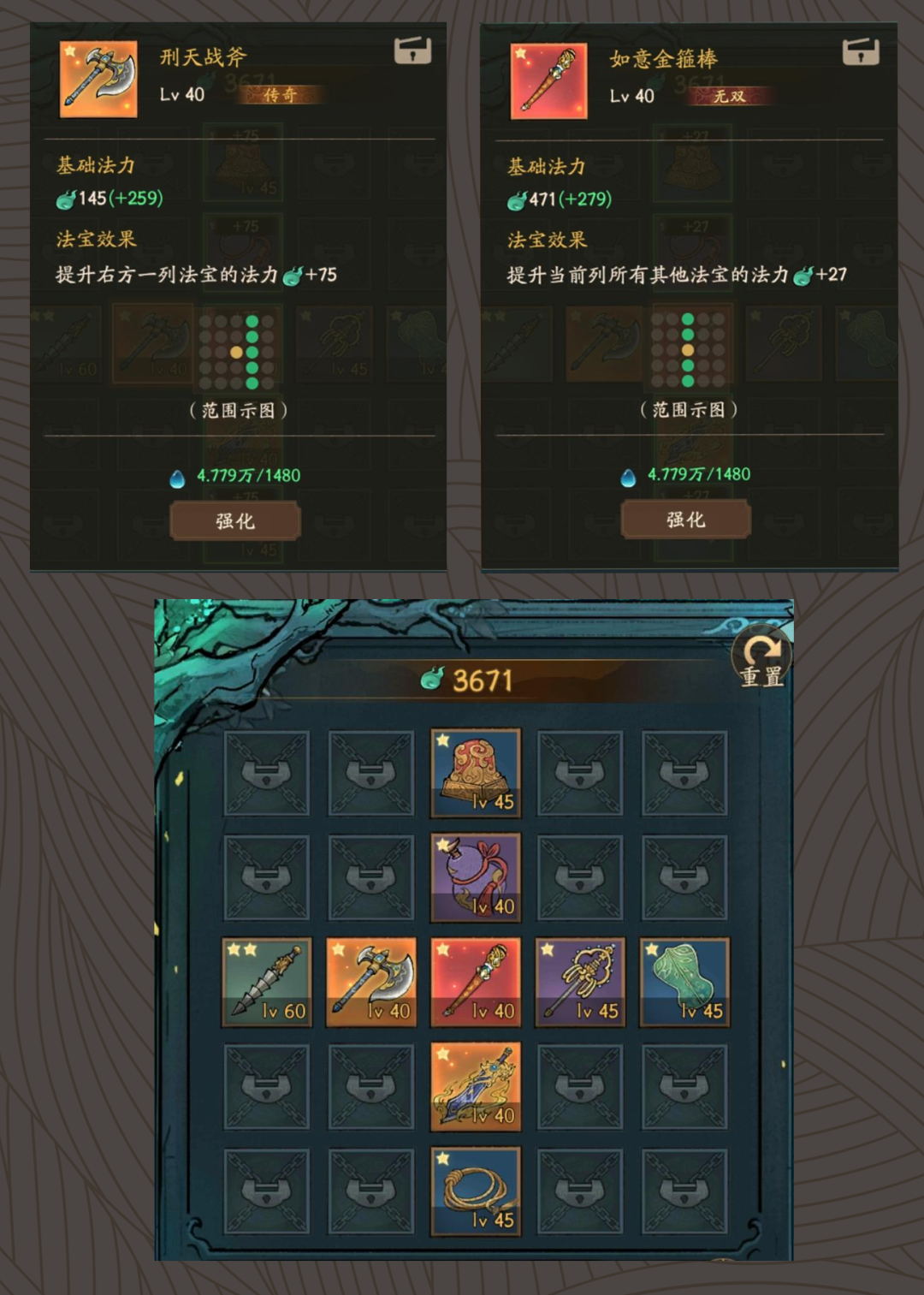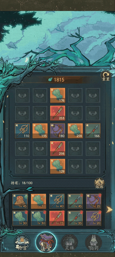 老壶这里有个小提示:掌柜可以拖拽待放置的、带上升标志的法宝,替换原来阵列中带上升标志的法宝,以及时提高吴刚的法力!