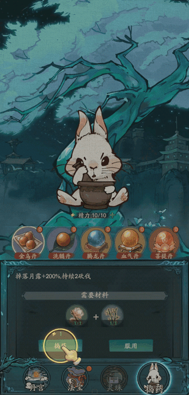 除了法宝和灵珠可以帮助增长吴刚的属性,可爱的玉兔也在努力制作丹药为吴刚提供不同的加成。利用月桂树掉落的草药,请玉兔将它们捣成丹药来帮助吴刚吧!