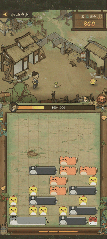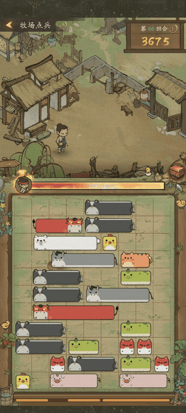 移动动物方块,使同一行位置填满,即可消除,如果动物超过场地存放上限时点兵结束,并结算本剧积分,快来帮助小牧童实现他的将军梦吧!