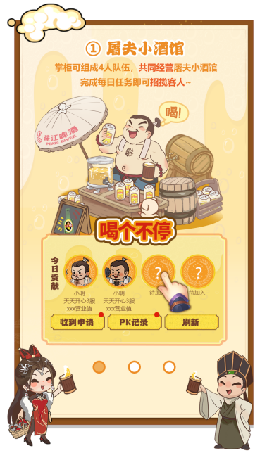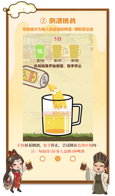 掌柜们快来帮助屠夫经营酒馆,为客人们倒适量啤酒吧~
