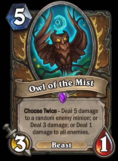 选择两次:随机对一个敌方随从造成5点伤害;或造成3点伤害;或对所有敌人造成1点伤害。
