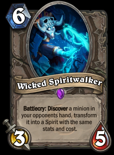 战吼:发现你对手手牌中的一张随从牌,将其变形成为一个属性值和法力值消耗均相同的灵魂。