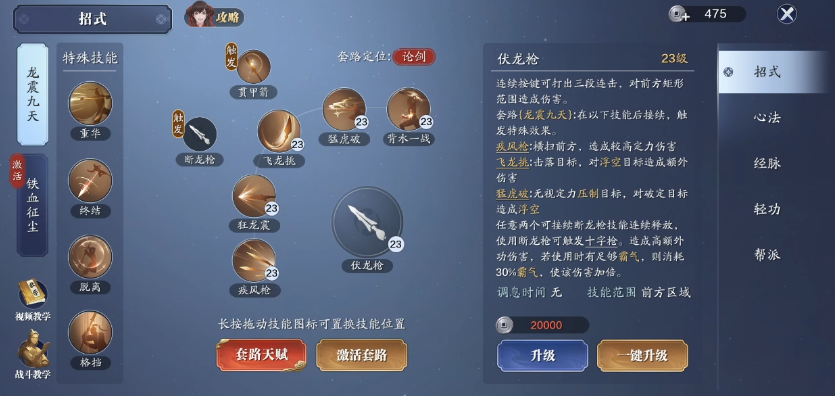 但是论剑套路龙震九天还是特别讲究连招的,最好的效果是先手格挡反击,拉近距离后再用飞挑接疾风枪接普攻打出一套连招,飞龙挑、猛虎破、疾风枪、背水一战四个技能都会有特殊的普攻加成效果,所以我们需要熟练掌握这些特殊效果之间的联动才能打出最好的效果。