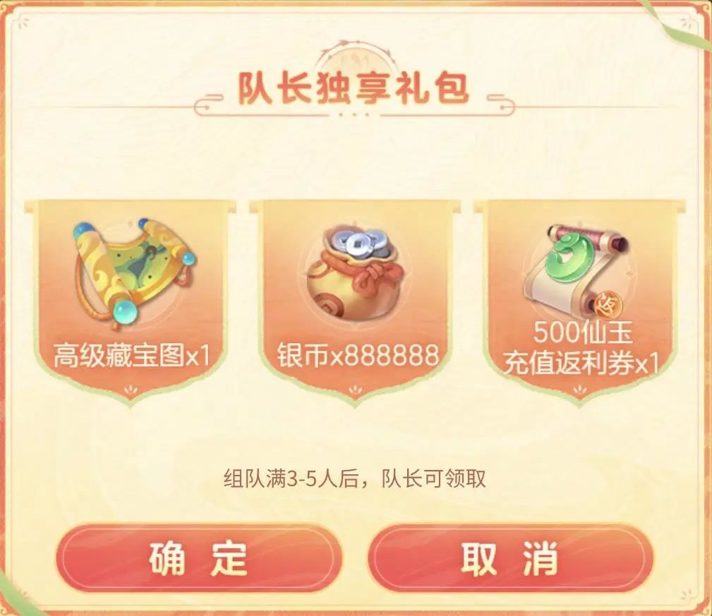 队伍集结成功之后,身为队长的少侠可以获得队长独享礼包,礼包中包含1张【高级藏宝图】、大量【银币】以及1张【500仙玉充值返利券】。