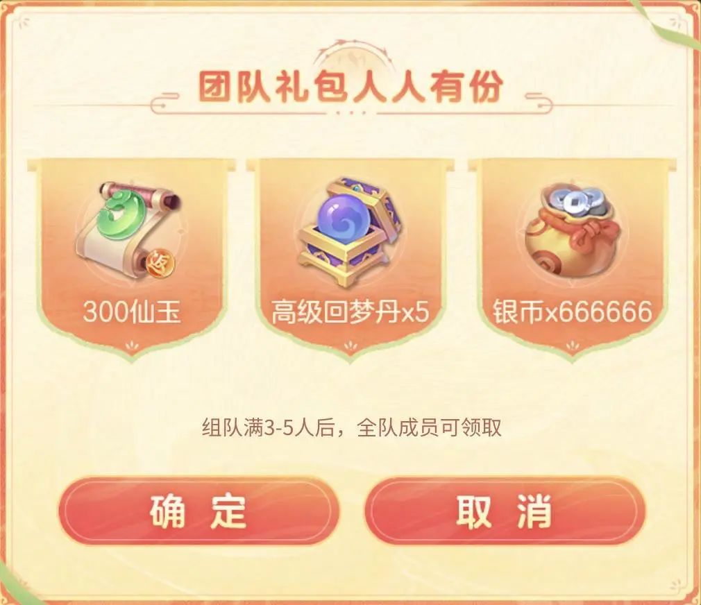 团队成员可以获得团队礼包,礼包中包括一张【300仙玉充值返利券】、【高级回梦丹*5】和大量【银币】。