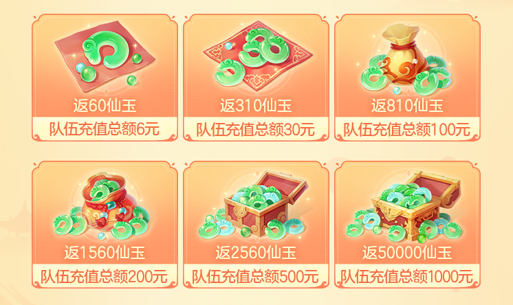 固定队充值返利可与个人充值返利叠加,团队充值最高充1000元返50000仙玉,豪礼相赠助力各位畅玩三界!