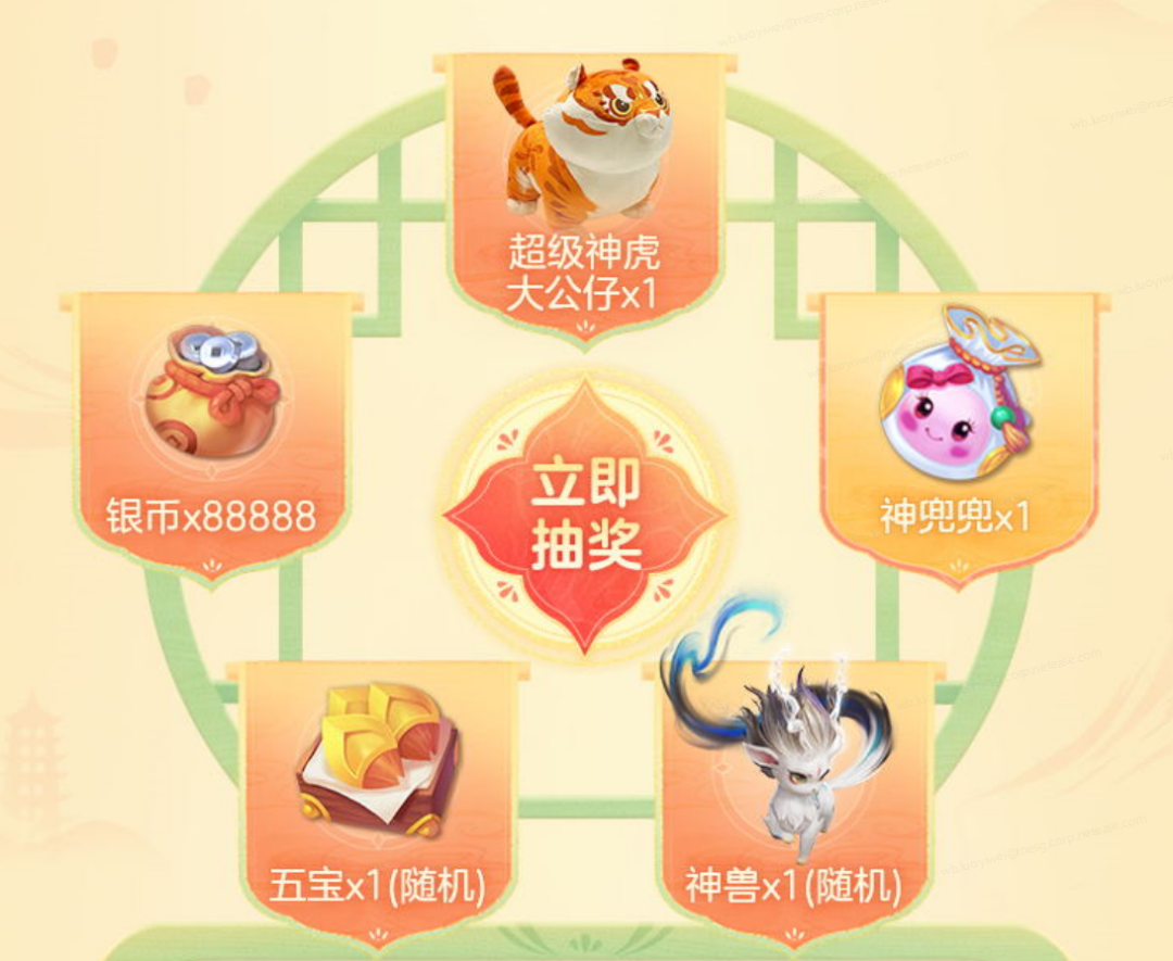 团队已有成员邀请其他成员时,邀请人和被邀请人均可获得1次抽奖机会,首次分享抽奖结果可额外获得1次抽奖机会,参与抽奖即有机会获得【神兽*1(随机)】、【超级神虎大公仔】、【五宝*1(随机)】和大量【银币】!