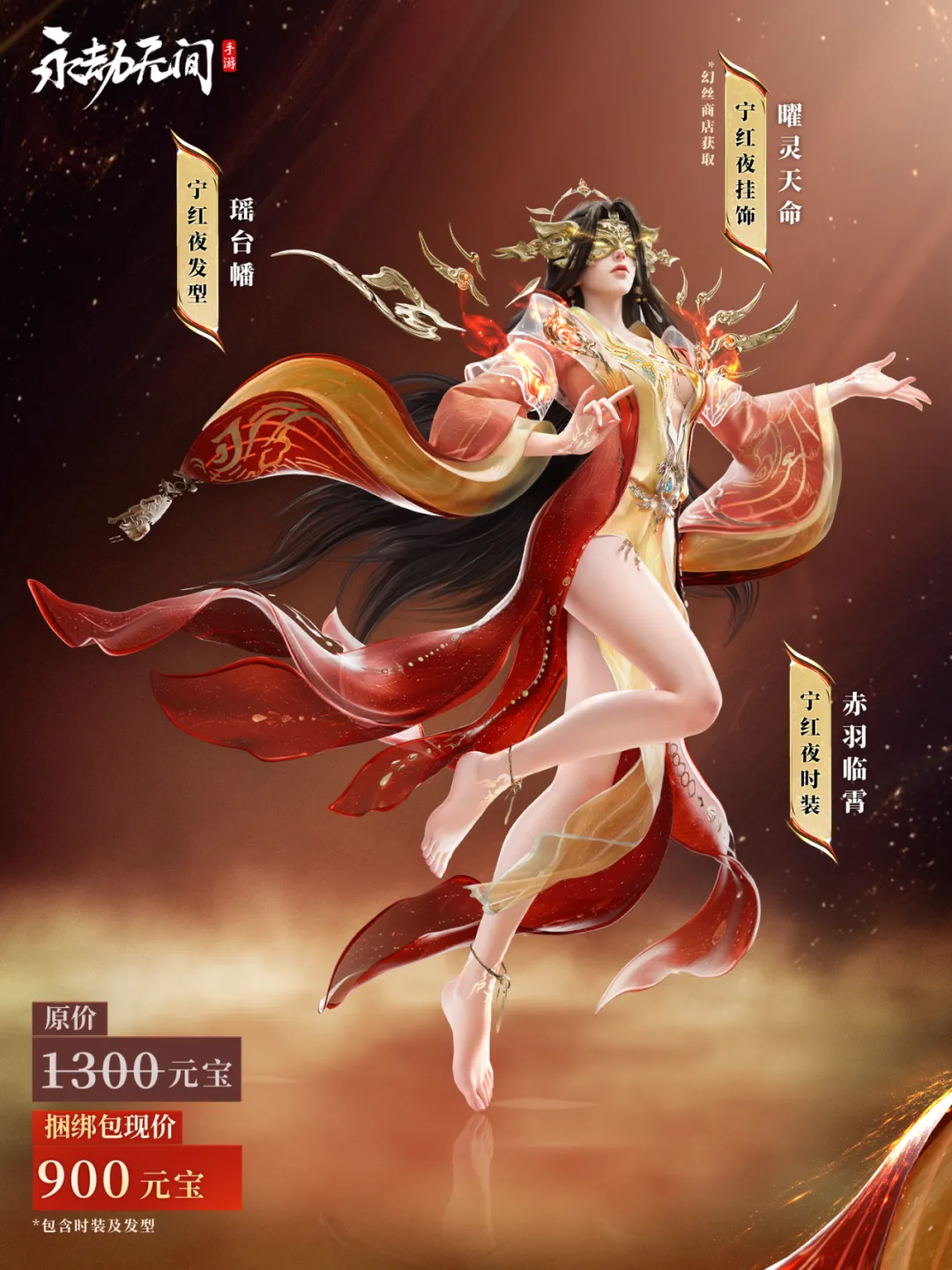 2、新增宁红夜捆绑包【赤羽临霄捆绑包】。捆绑包内含宁红夜极品时装【赤羽临霄】、宁红夜极品发型【瑶台幡】。捆绑包原价1300元宝,折扣价900元宝。单独购买对应单品即可享受折扣,购买捆绑包将享受更多折扣。
