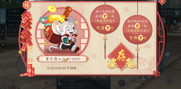 活动介绍:通过完成日常任务、活动,领取活跃度宝箱等方式可获得“鼠钱”,1枚鼠钱等于10绑元,活动期间内最多可存入6000绑元,活动结束后即可全部领取!让你“鼠”钱数到手软~