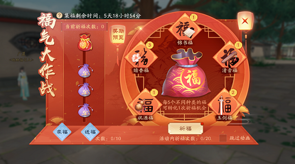 活动介绍:活动期间,完成每日活动、日常任务即有机会额外获得活动专属道具“福”字,集齐五福即可获得绑元、稀有家具等惊喜福利,集齐达到一定次数还有极品红装、檀香等丰厚奖励哦~