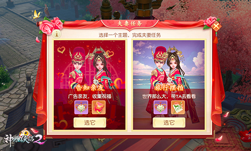 看到那些亲密值奖励,是否觉得只有“爱你的心”,成长还不够迅速?那就绝不能错过每周1次的夫妻任务。每周主题随机,大侠可以从2种主题中选择其一来完成。每周任务共有25轮,夫妻之间亲密互动,留下甜蜜纪念。心动的瞬间,可以用图片或文字形式留在夫妻空间中。想要常常回味,就不要偷懒不记录呀。