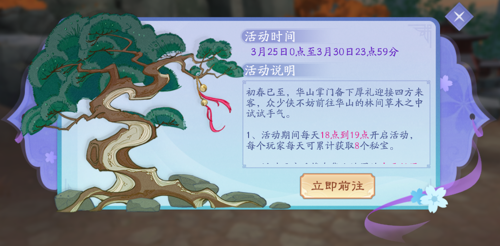 2、活动开启后将在华山地图的【东元门区域】、【松桧古道区域】随机刷新秘宝,开启可获得奖励。