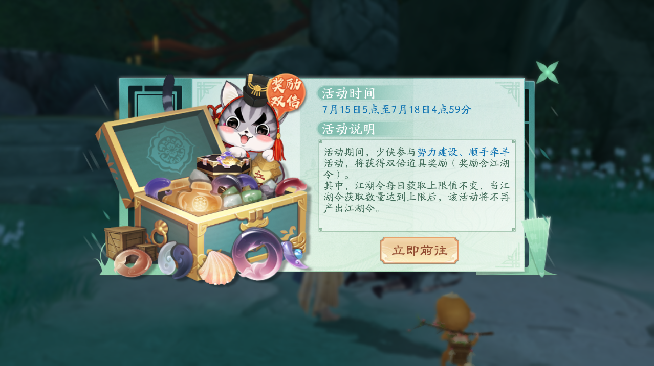 活动说明:活动期间,少侠参与势力建设、顺手牵羊活动,将获得双倍的道具奖励(奖励含江湖令)!其中,江湖令每日获取上限值不变,当江湖令获取数量达到上限后,该活动将不再产出江湖令。