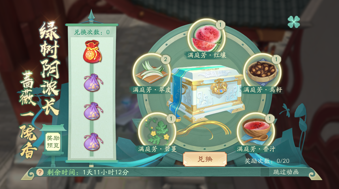 活动说明:绿树浓阴长,蔷薇一院香。少侠需要参与日常活动、任务等收集道具,集齐五种道具进行兑换必得绑元红包,有概率获取1级名师自选、随机5级缀玉等好礼!累计兑换一定次数,还可获取大量檀香、限时背饰。
