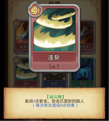 战斗牌有普通攻击、连斩、旋风斩等,其中连斩是一个不错的卡牌,在面对BOSS的时候,能够快速的打满愤怒,也是一个快速破盾的好选择。
