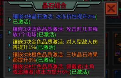 3.晶石组合:主要看金色、橙色和红色词条(装备晶石也适用),金色、橙色词条较强属性为:宝石效果提升、伤害提升等。红色词条较强属性为:提升攻击。