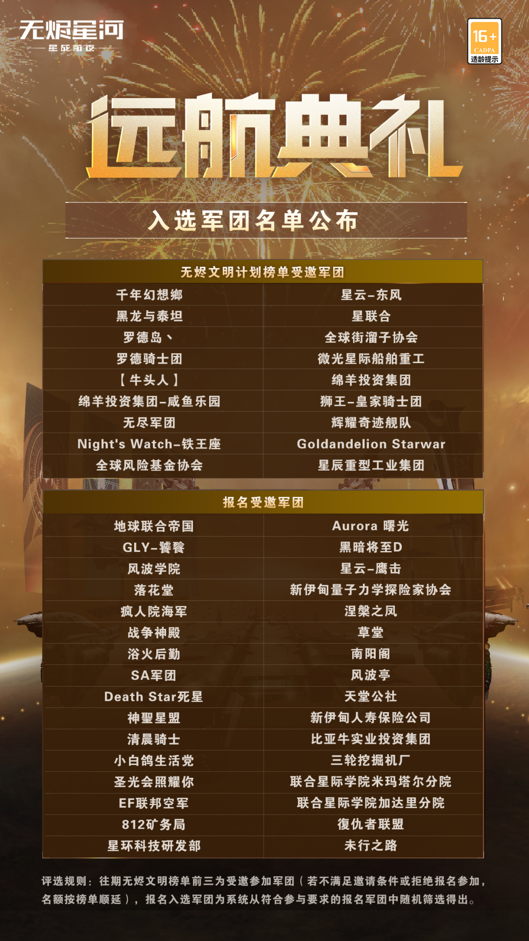 暂未入选本次远航庆典活动的军团,也无需遗憾,后续我们将在重大节日之时,再度开启此项活动,期待能在未来的活动中看到更多军团的身影!