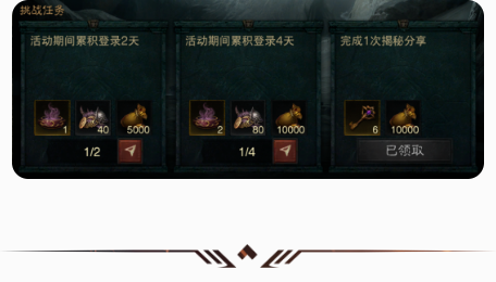 活动期间内,挑战任务不会刷新。完成分享发掘揭秘活动、累计登录等任务就可以获得金币、噬月材料、噬月之尘以及神殿宝箱钥匙奖励。