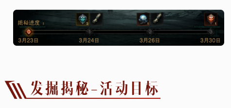 活动期间每天03:00活动进度将会增长,解锁发掘线索并逐渐揭开秘密。在3月24日、26日、30日还可领取不朽钥石、大地珍珠、强化不朽钥石奖励,