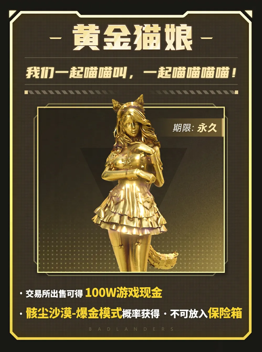 进入骸尘沙漠-爆金模式后,地图将会标记出3个特殊地点。砖友们前往该地点进行搜刮即有概率获得新大金【黄金猫娘】和【黄金兔娘】。