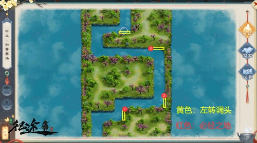 因为龙舟需要撞墙调头才能左转,所以图中4个黄框的墙壁是龙舟必须碰撞的地方。再结合龙舟比赛的整体路线方向,不难找出地图上有3个“必经之地”,就是图中黄框墙壁一侧的①、②、③点。