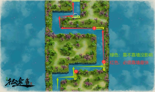 在进阶的路线规划之上,还有一个终极的路线规划,但是需要4人掌握右舵(或者全族都能听指挥,保证左转时左边其他人不乱按),让龙舟能够自如地转向,不必再去撞墙!但是,如果4个人的动作不够整齐,龙舟将在原地画小圈,反而影响效率!所以,如果不是跟族长5黑的话,请不要轻易尝试4人掌右舵,容易友尽!话不多说,直接说路线规划: