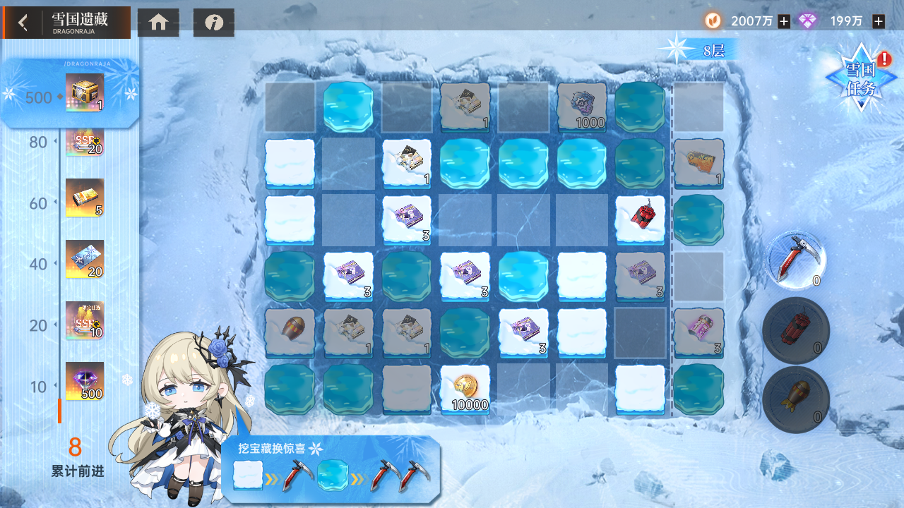 活动期间,专员们可游玩雪国遗藏挖宝小游戏 !游玩即可获取大量稀有奖励!根据累计前进进度可获取「钻石」「限定伙伴碎片任选」「幻化印记」「招募资源任选」「光暗SSR龙文碎片」「觉醒资源任选」等稀有奖励!