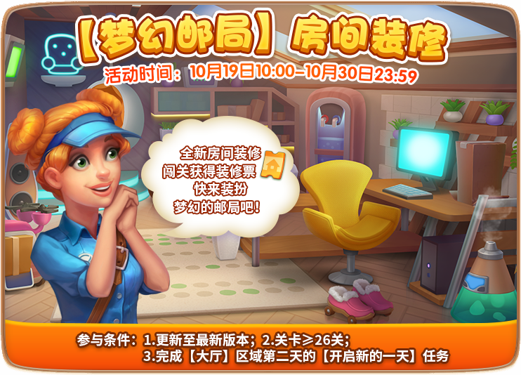 活动玩法:小主人们通过闯关完成任务获得装修票,再用装修票即可进行邮局大改造,帮助丽莎就等你啦!另外首通有三倍的装修票,活动期间,小主人们还可获得双倍的装修票哦!