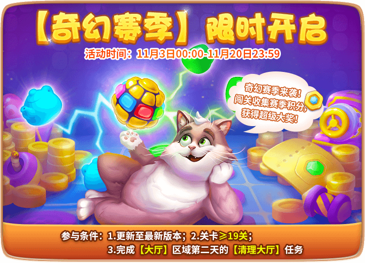 活动玩法:“道具短赛季”活动限时开启,常规关卡及冠军赛关卡均参与活动,活动期间,成功闯关即可获得积分,累计积分可提升活动等级,每个等级均有奖品领取哟~两段赛季接力开启,让你一次玩个够!