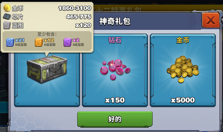 神奇礼包:钻石*150,金币*5000,神奇补给箱*1