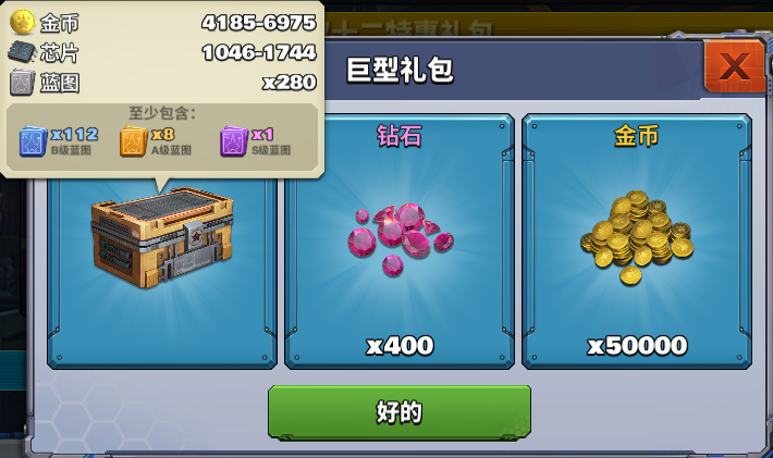 巨型礼包:钻石*400,金币*50000,巨型补给箱*1