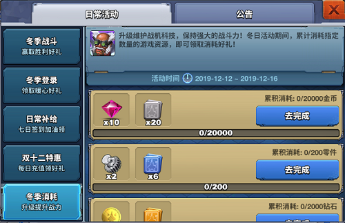 升级维护战机科技,保持强大的战斗力!冬日活动期间,累计消耗指定数量的游戏资源,即可领取消耗好礼!
